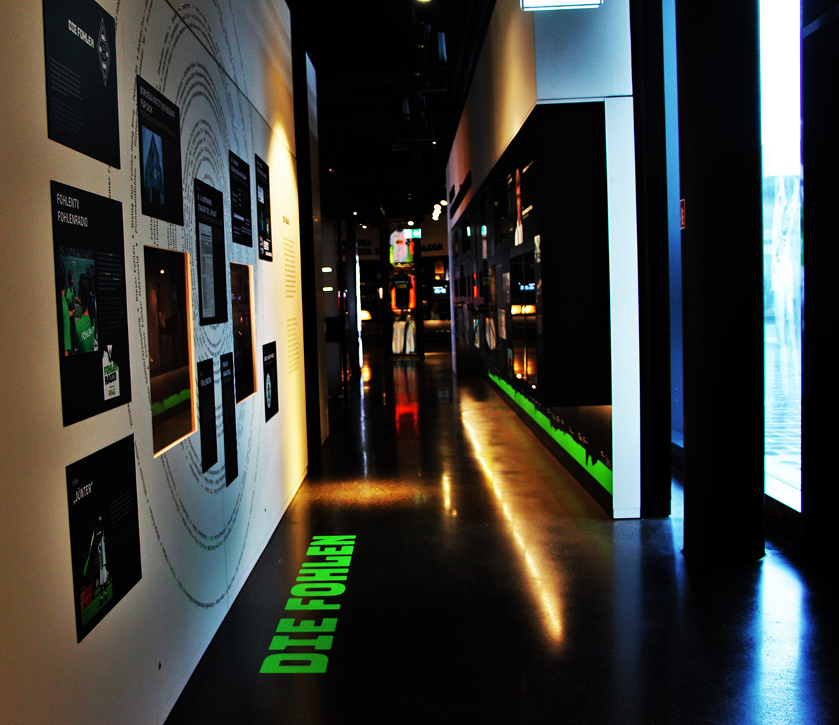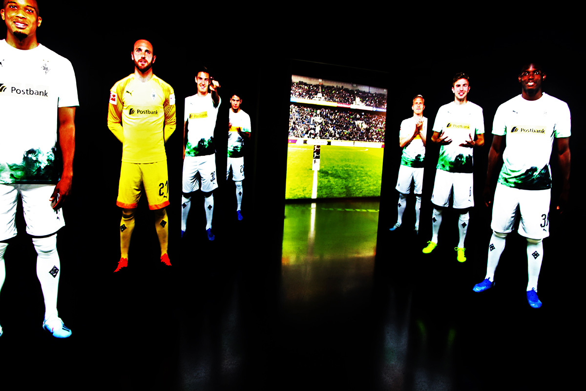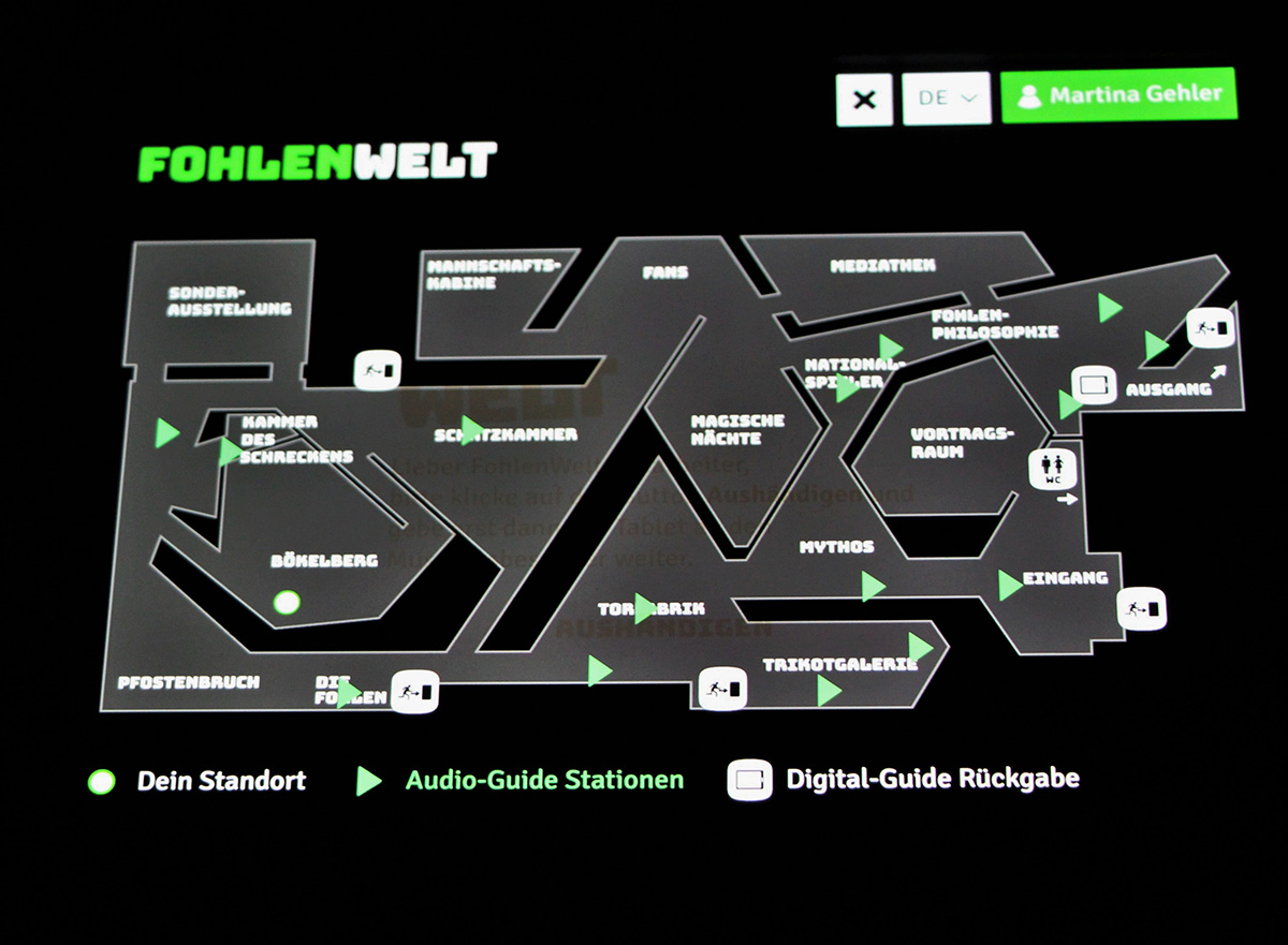 Das Museum bietet sehr viele interaktive Elemente, wie z. B. Schautafeln, Videos auf den zahlreichen Bildschirmen oder dem Audio-Guide. Am Eingang gibt es zum Audio-Guide ein Tablet, das durch die interaktive Ausstellung führt. Dort werden Sie auf zwei Screens von acht Persönlichkeiten empfangen, die auf unterschiedlichste Art und Weise etwas mit Borussia Mönchengladbach zu tun haben. Aus diesen acht Personen und drei verschiedenen Sprachen (deutsch, niederländisch und englisch) durften wir uns einen Audio-Guide aussuchen. Wahlweise standen die Stimmen von Christoph Kramer, Rainer Bonhof, Joko Winterscheidt, der ehemalige Stadionsprecher Rolf Göttel oder Knippi, der eine Führung für die jüngsten Fans eingesprochen hat, zur Verfügung.