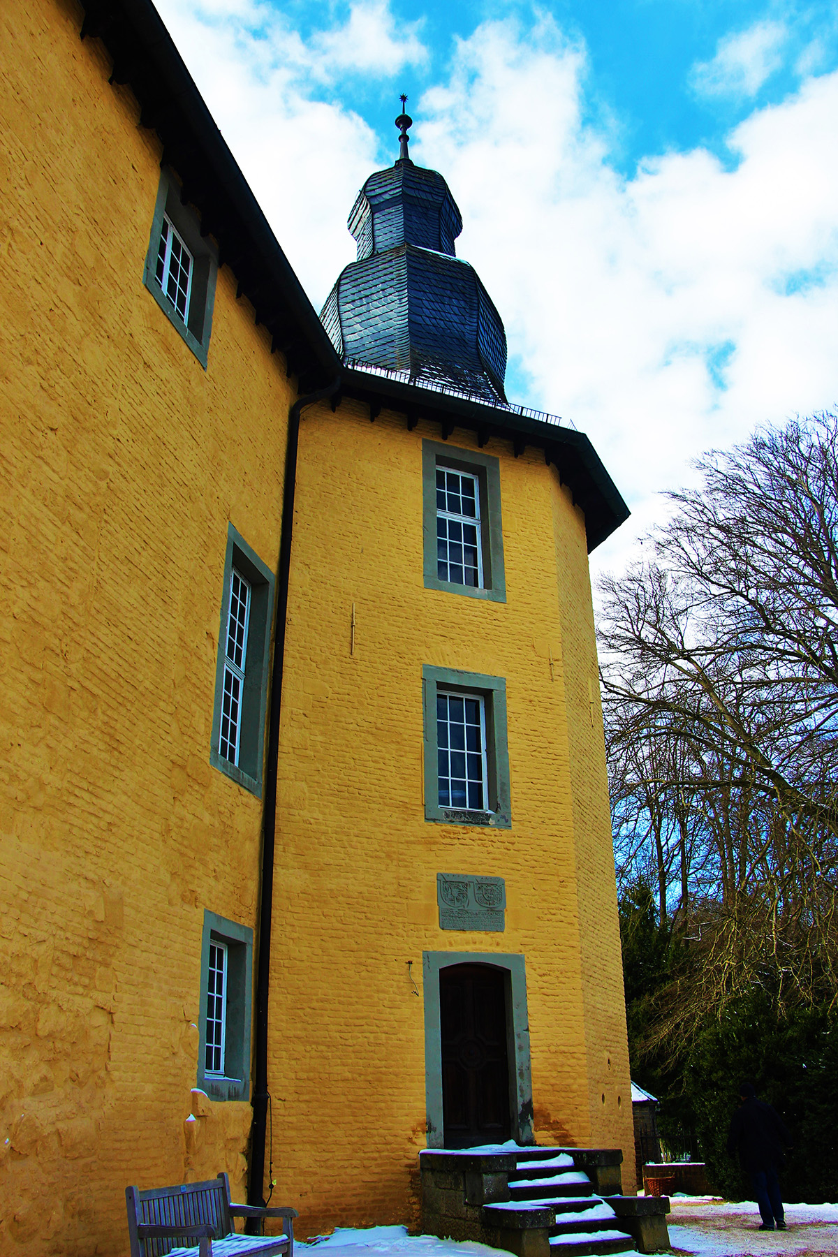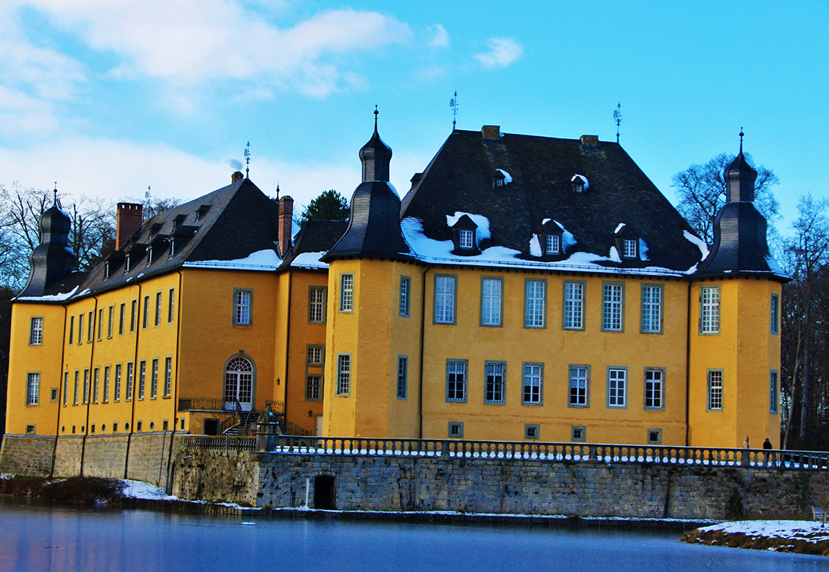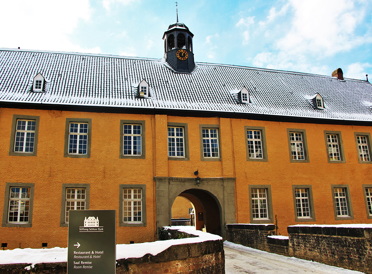 Das Schloss Dyck ist eines der bedeutendsten Wasserschlösser. Die Anlage besteht aus einer Hochburg und zwei Vorburgen die von einem Wassergraben umgeben sind. Das vierflügelige, von Ecktürmen begrenzte Schloss umgibt einen fast quadratischen Innenhof. Die Gebäude gehen im Wesentlichen auf den Stand nach den Zerstörungen im Dreißigjährigen Krieg zurück.