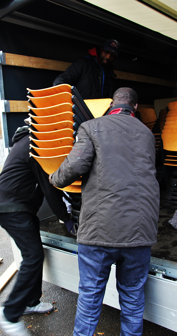 Beim Verladen der 84 Stühle und 42 Tische halfen die Vorstandsmitglieder Taufik Sulemana, Alaji Agbere und Vereinsmitglied Adam Awal fleißig mit.