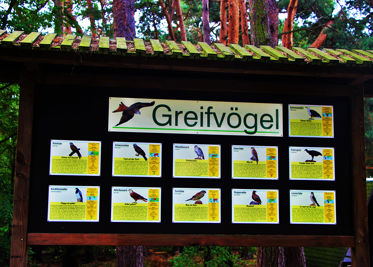 Ein besonderes Highlight ist die Falknerei bzw. die Greifvogel- bzw. Flug-Vorführungen, beispielsweise Schreiseeadler „Cleo“, dessen markanter Ruf auch die „Stimme Afrikas“ genannt wird.