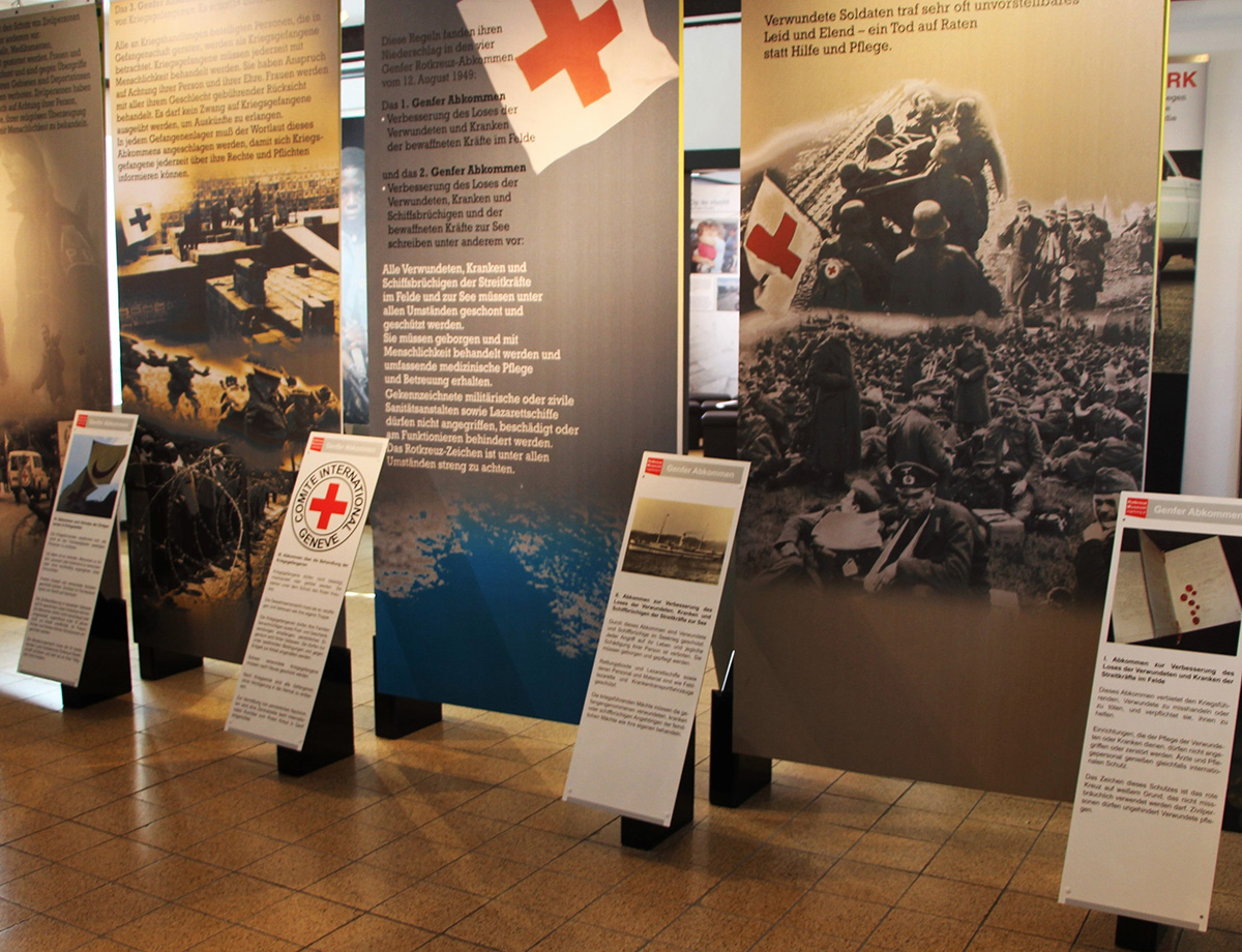 Der Fokus der Ausstellung liegt auf dem humanitären Völker- und Menschenrecht, der Geschichte und der internationalen humanitären Arbeit der Rotkreuzbewegung und der Genfer Konventionen.