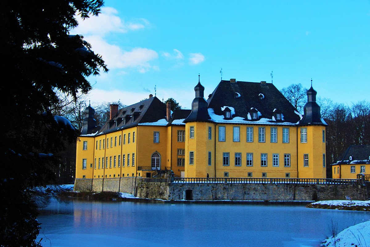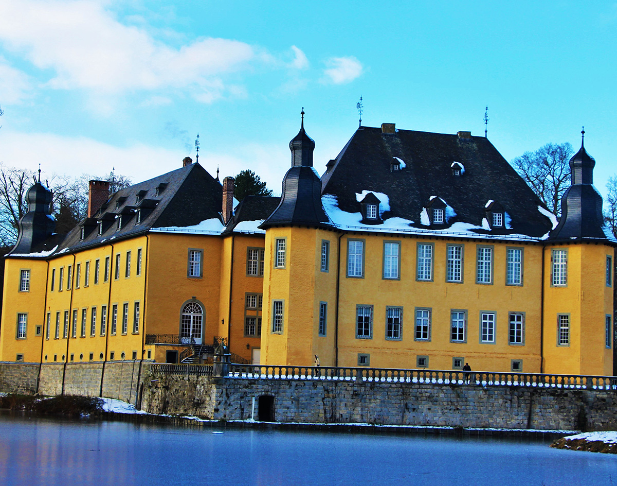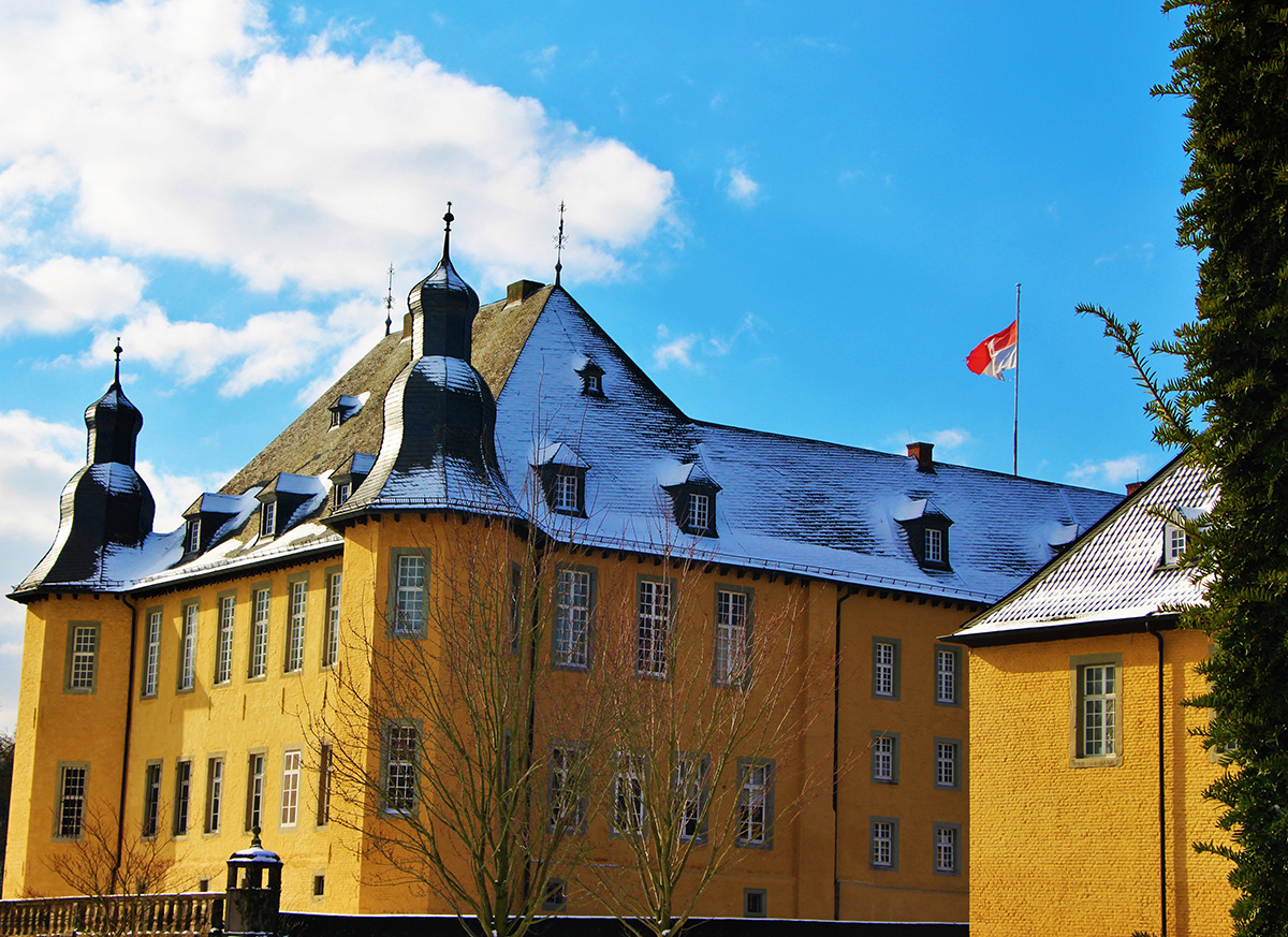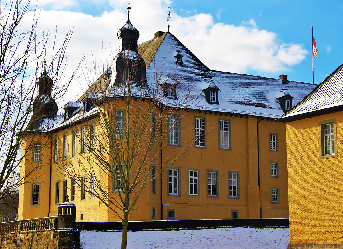 Das Schloss Dyck ist eines der bedeutendsten Wasserschlösser. Die Anlage besteht aus einer Hochburg und zwei Vorburgen die von einem Wassergraben umgeben sind. Das vierflügelige, von Ecktürmen begrenzte Schloss umgibt einen fast quadratischen Innenhof. Die Gebäude gehen im Wesentlichen auf den Stand nach den Zerstörungen im Dreißigjährigen Krieg zurück.