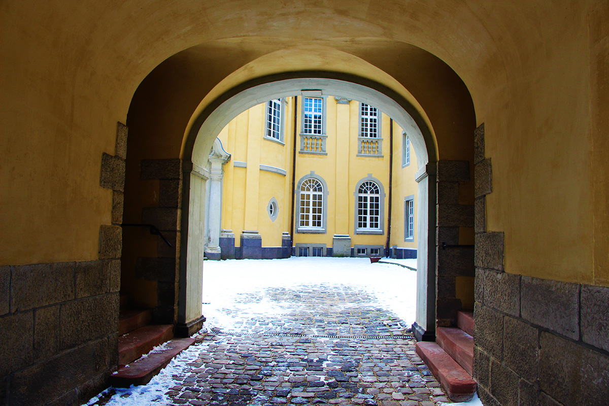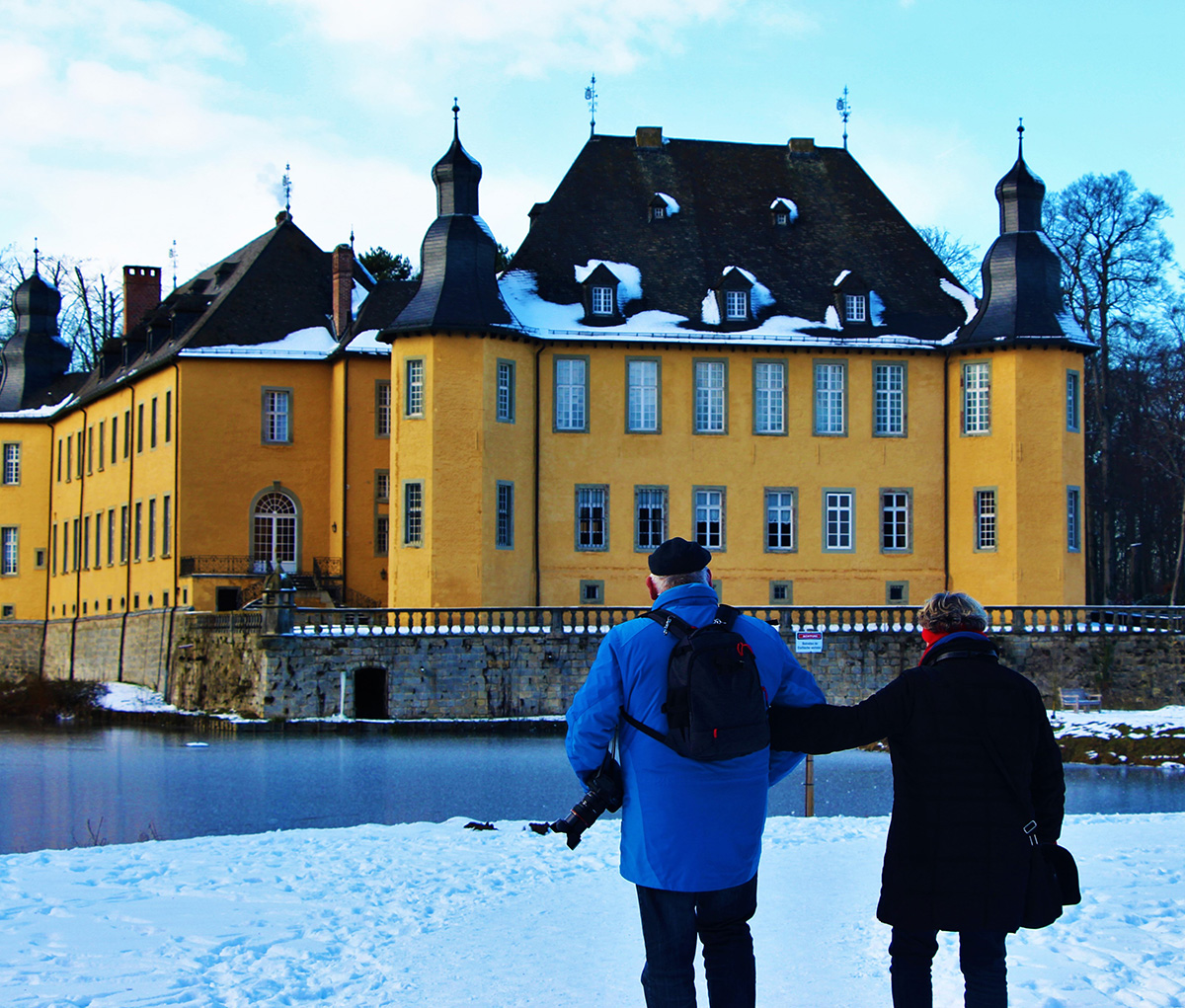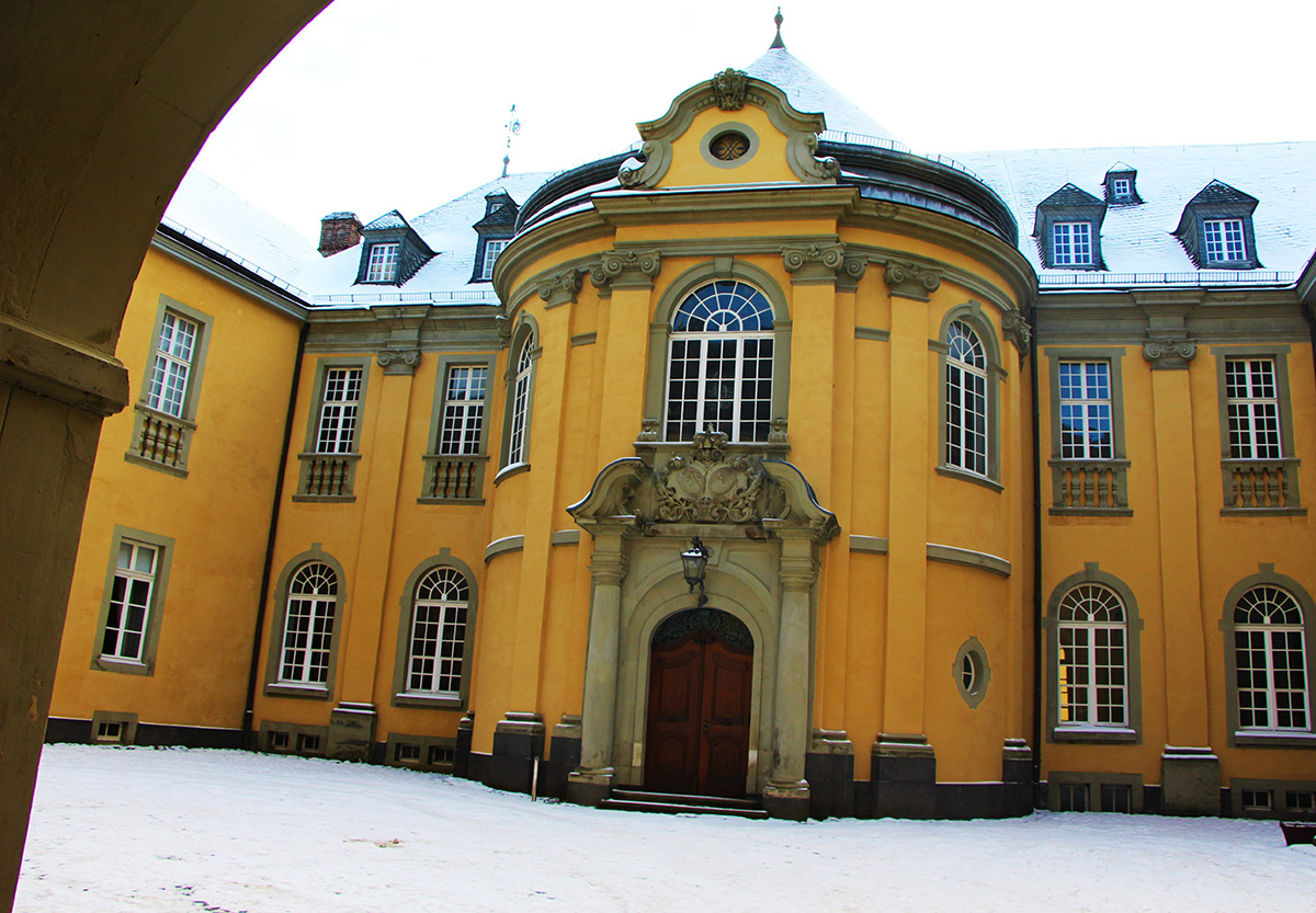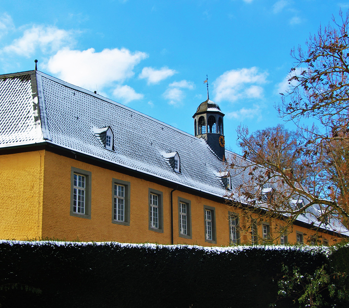 Das Schloss Dyck ist eines der bedeutendsten Wasserschlösser. Die Anlage besteht aus einer Hochburg und zwei Vorburgen die von einem Wassergraben umgeben sind. Das vierflügelige, von Ecktürmen begrenzte Schloss umgibt einen fast quadratischen Innenhof. Die Gebäude gehen im Wesentlichen auf den Stand nach den Zerstörungen im Dreißigjährigen Krieg zurück.