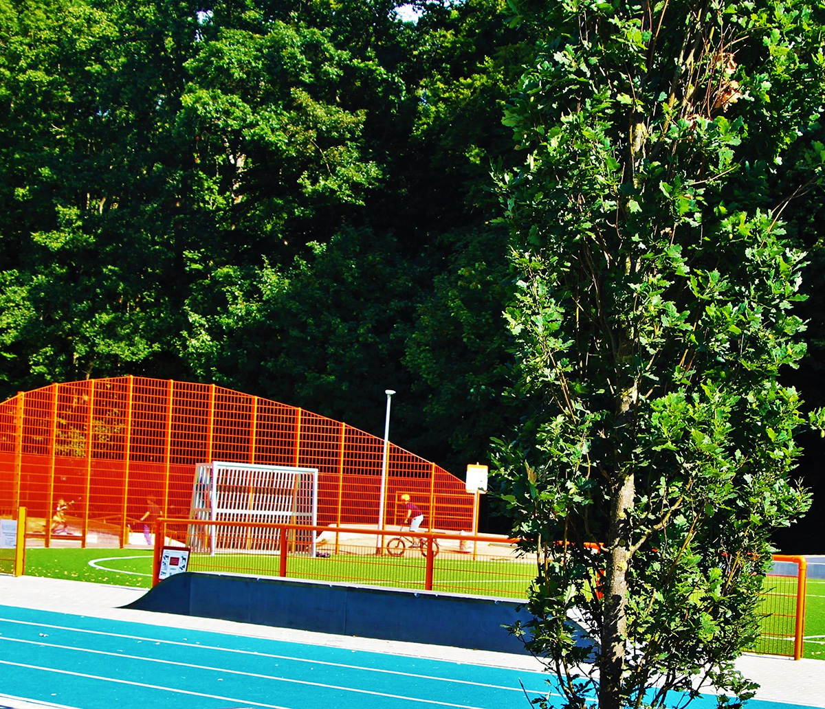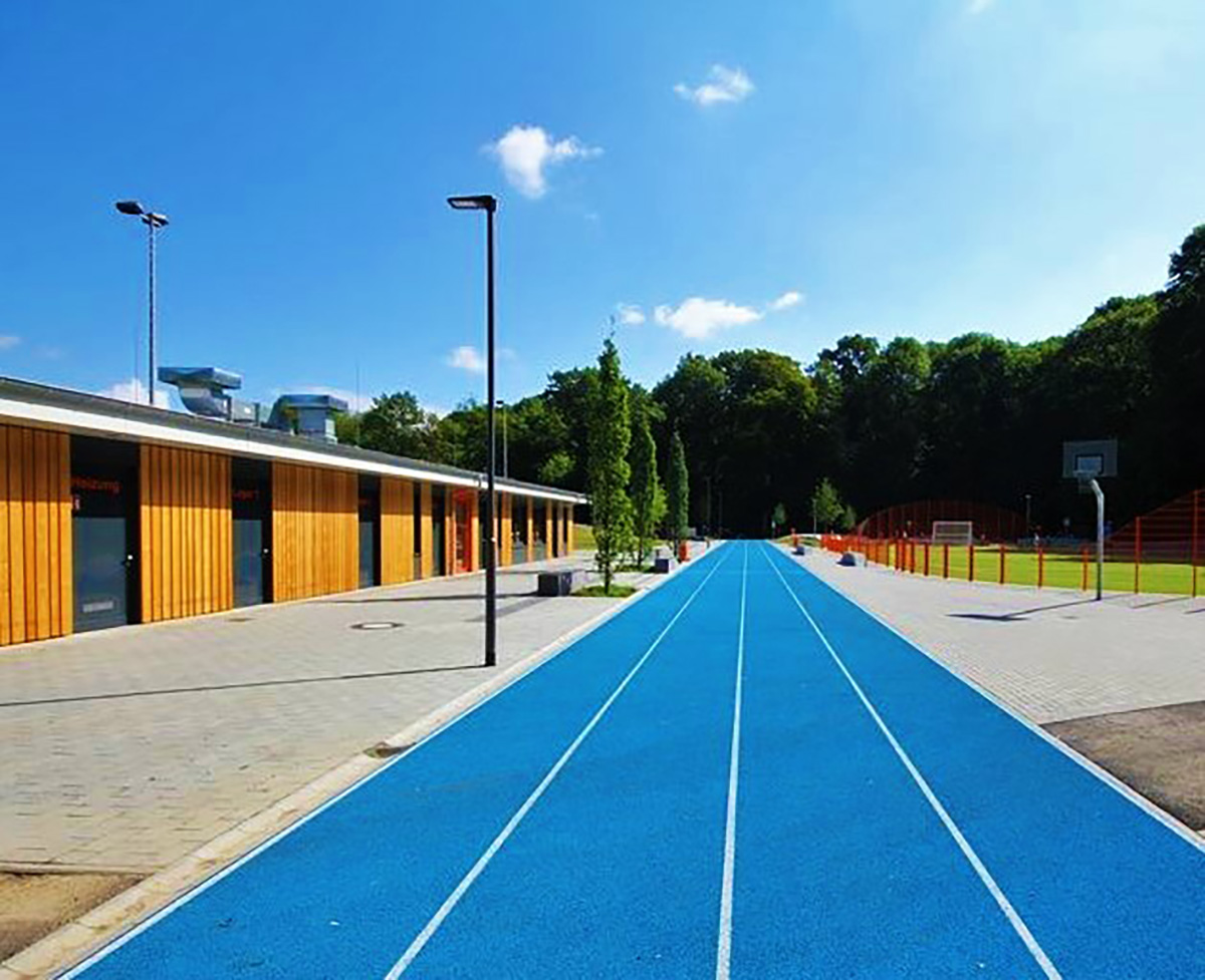 Der Mittelpunkt der Anlage ist das neue Multifunktionsgebäude mit Umkleiden und Mehrzweckräumen, die nicht nur Vereinen, sondern auch für Quartiersarbeit zur Verfügung stehen.