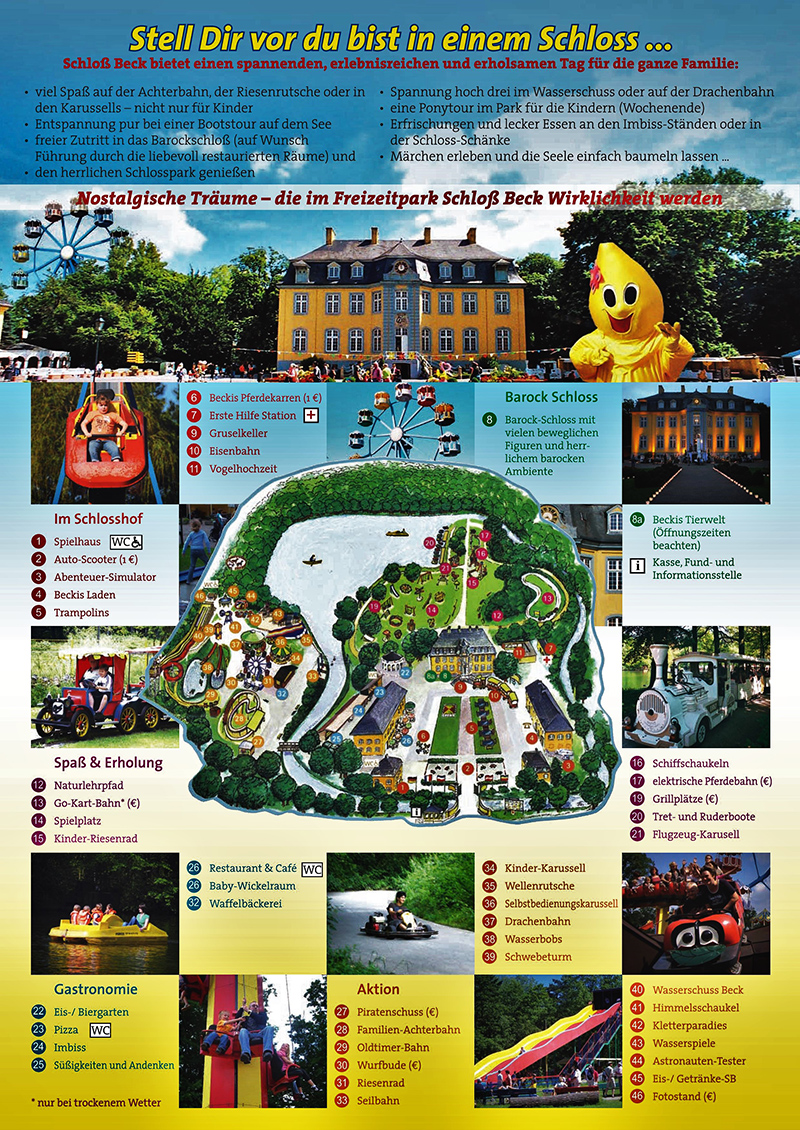 Der Freizeitpark Schloss Beck bietet Kindern und ihren Eltern eine bunte Mischung von abenteuerlichen Spielplätzen, Spielhäuser, Klettern und vieles mehr.