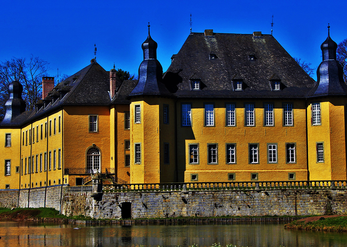 Das Schloss Dyck ist eines der bedeutendsten Wasserschlösser. Die Anlage besteht aus einer Hochburg und zwei Vorburgen die von einem Wassergraben umgeben sind. Das vierflügelige, von Ecktürmen begrenzte Schloss umgibt einen fast quadratischen Innenhof. Die Gebäude gehen im Wesentlichen auf den Stand nach den Zerstörungen im Dreißigjährigen Krieg zurück.