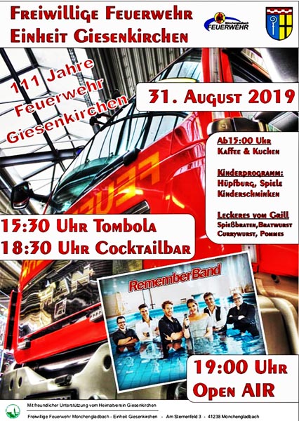 Wir danken der Freiwilligen Feuerwehr Giesenkirchen für das tolle Feuerwehrfest anlässlich ihres 111-jährigen Bestehens.