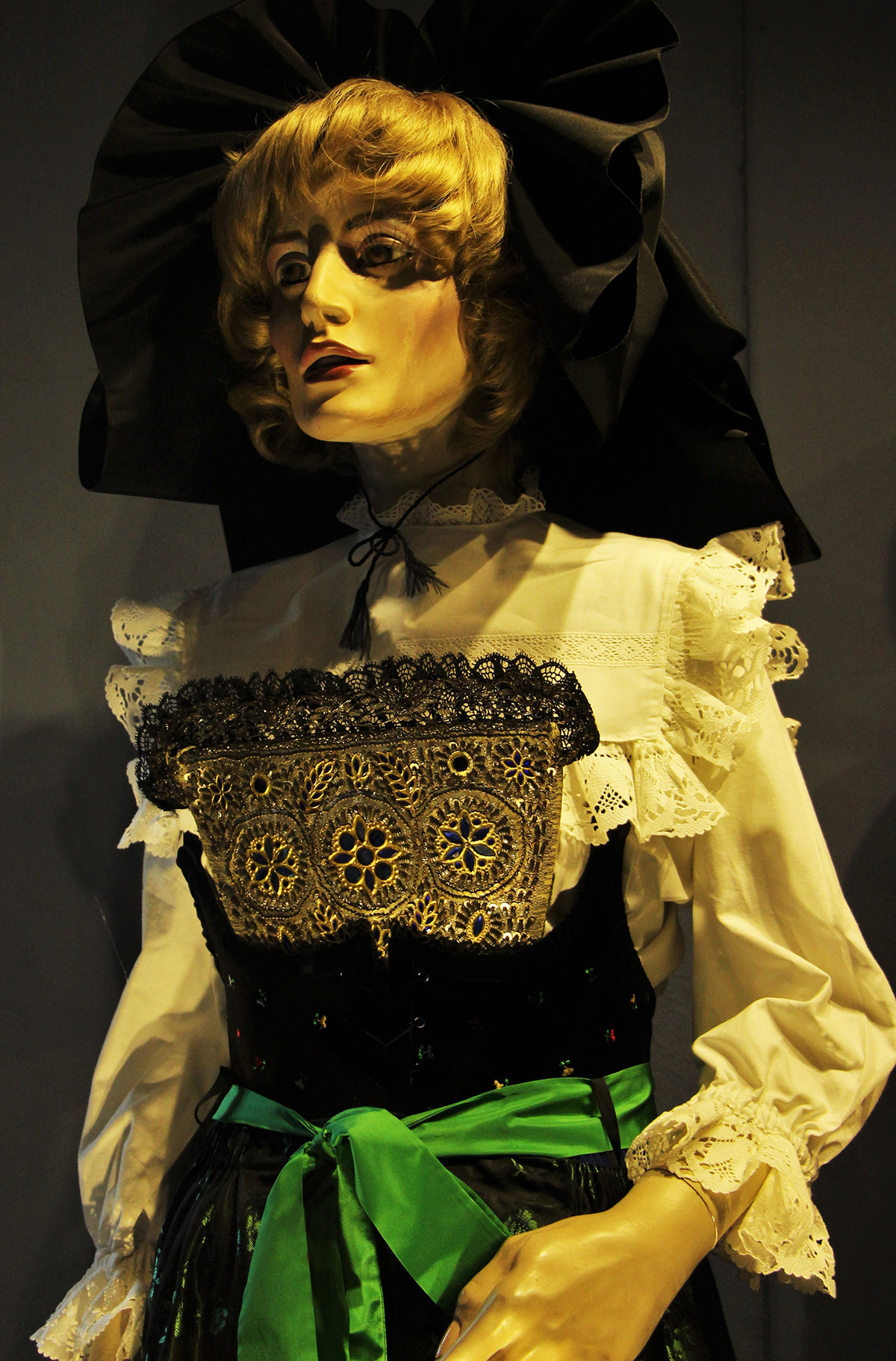 Neben der höchsten Festtrachten, der Marienbild- und auch Werktags-Trachten, wurden Accessoires wie Perlhandschuhe, Gebetbücher, bestickte Schuhe, Haar- bzw. Kopfschmuck und Strümpfe mit aufwändigen Strickmustern genau so präsentiert, wie hochwertige Stoffe aus Kaschmir, Schultertücher und prächtige Oberteile aus Samt und Seide.