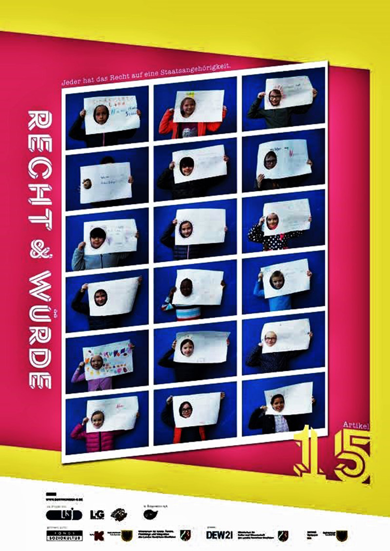 Beteiligte aus Kita-Gruppen, Schulklassen, Integrationszentren, Vereinen und Seniorentreffs haben Inhalte der Erklärung genauer unter die Lupe genommen einzelne Artikel fotografisch umgesetzt. Die Ausstellung zeigt die entstandenen Arbeiten, gesammelte Perspektiven und persönliche Erfahrungen mit Recht und Würde. Sie lädt Besucher/-innen ein sich auch selbst spielerisch mit den Menschenrechten auseinanderzusetzen.