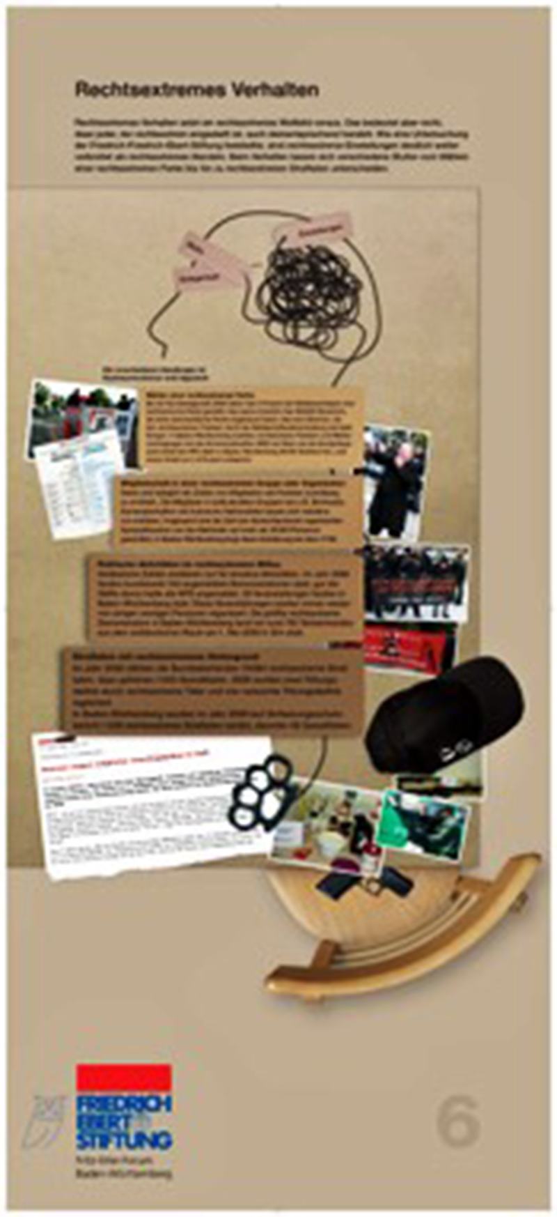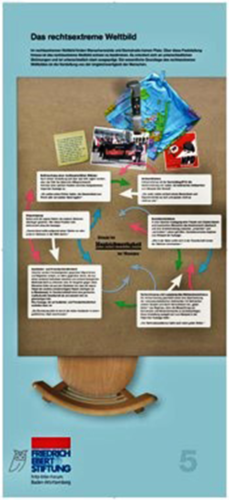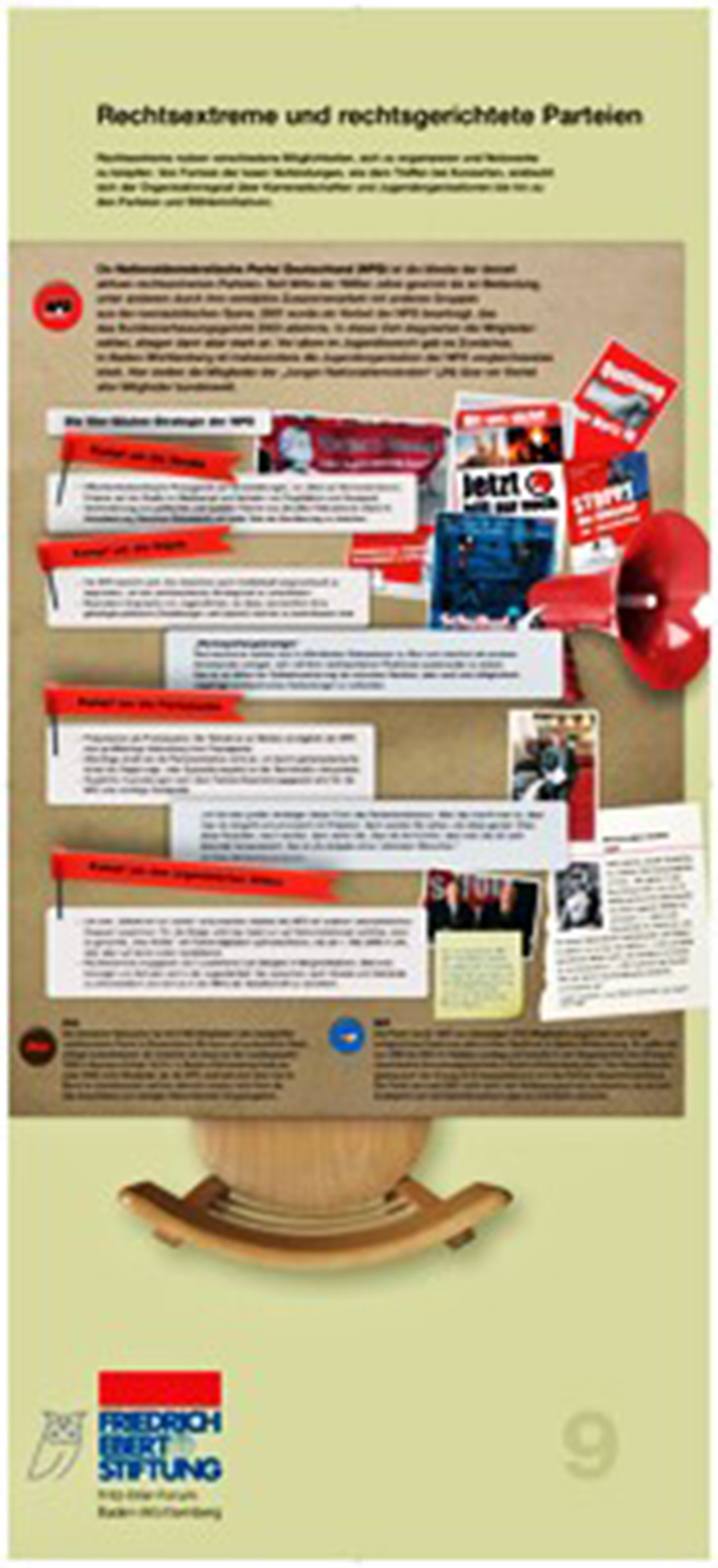 Die speziell für Jugendliche gestaltete Ausstellung des Forums Jugend und Politik der Friedrich-Ebert-Stiftung weist auf 15 Ausstellungstafeln auf die Gefahren hin, die vom Rechtsextremismus für Demokratie und Menschenrechte ausgehen, und informiert über die verschiedenen Facetten des Rechtsextremismus mit speziellem Fokus auf Entwicklungen in Nordrhein-Westfalen. Es werden mögliche Gründe für und die Ausprägungen von rechtsextremen Einstellungen und Weltbildern dargestellt und aufgezeigt, welche Formen rechtsextremes Verhalten annehmen kann. Dabei wird der Bogen von rechtsextremen Einstellungen über das Engagement in rechtsextremen Organisationen und Parteien bis hin zur rechtsextrem motivierten Straftat geschlagen. Ein besonderer Fokus der Ausstellung liegt darauf, aufzuzeigen, wie man sich gegen Rassismus und Gewalt und für Demokratie und Menschlichkeit einsetzen kann. Die Ausstellung möchte gegen eine Normalisierung rechter Einstellungen und Übergriffe