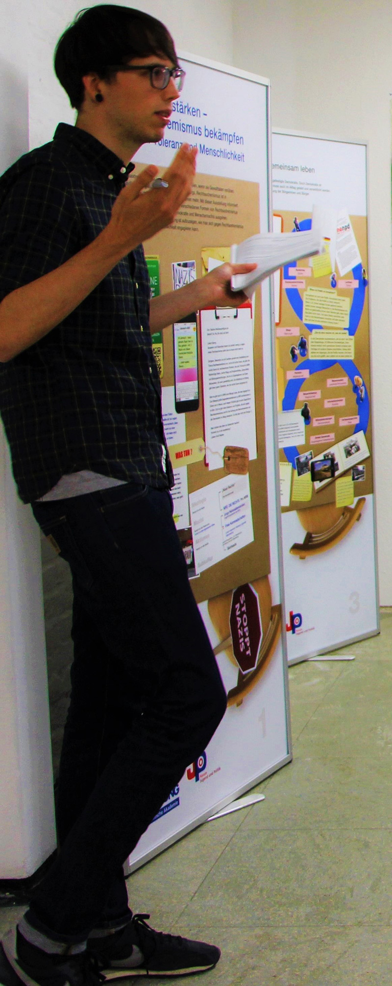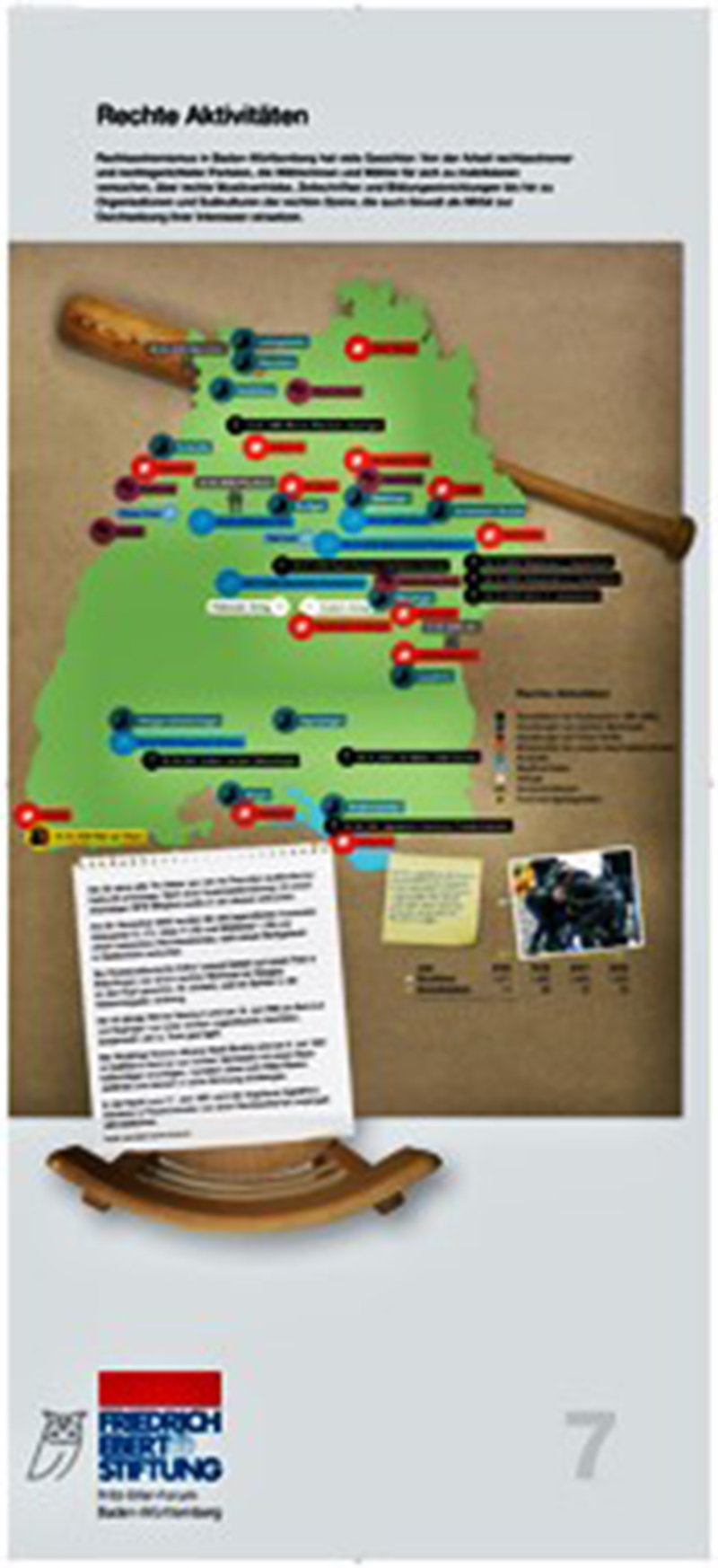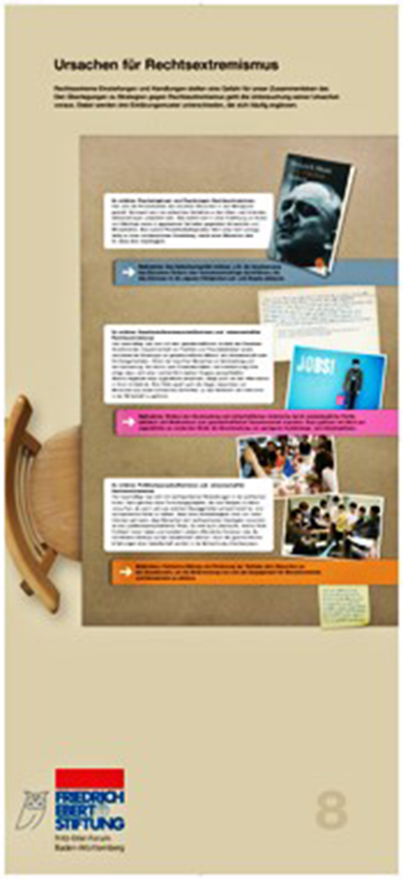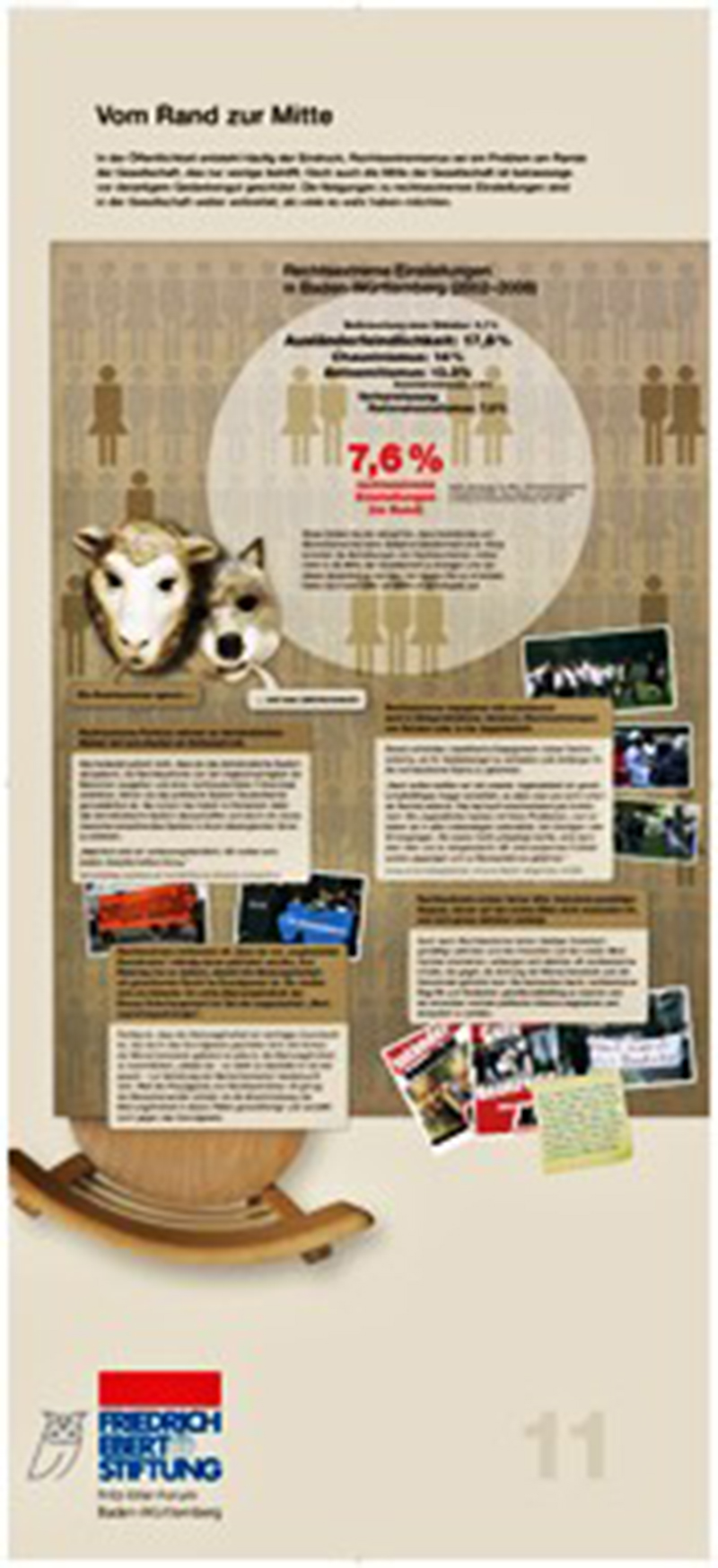 Die speziell für Jugendliche gestaltete Ausstellung des Forums Jugend und Politik der Friedrich-Ebert-Stiftung weist auf 15 Ausstellungstafeln auf die Gefahren hin, die vom Rechtsextremismus für Demokratie und Menschenrechte ausgehen, und informiert über die verschiedenen Facetten des Rechtsextremismus mit speziellem Fokus auf Entwicklungen in Nordrhein-Westfalen. Es werden mögliche Gründe für und die Ausprägungen von rechtsextremen Einstellungen und Weltbildern dargestellt und aufgezeigt, welche Formen rechtsextremes Verhalten annehmen kann. Dabei wird der Bogen von rechtsextremen Einstellungen über das Engagement in rechtsextremen Organisationen und Parteien bis hin zur rechtsextrem motivierten Straftat geschlagen. Ein besonderer Fokus der Ausstellung liegt darauf, aufzuzeigen, wie man sich gegen Rassismus und Gewalt und für Demokratie und Menschlichkeit einsetzen kann. Die Ausstellung möchte gegen eine Normalisierung rechter Einstellungen und Übergriffe
