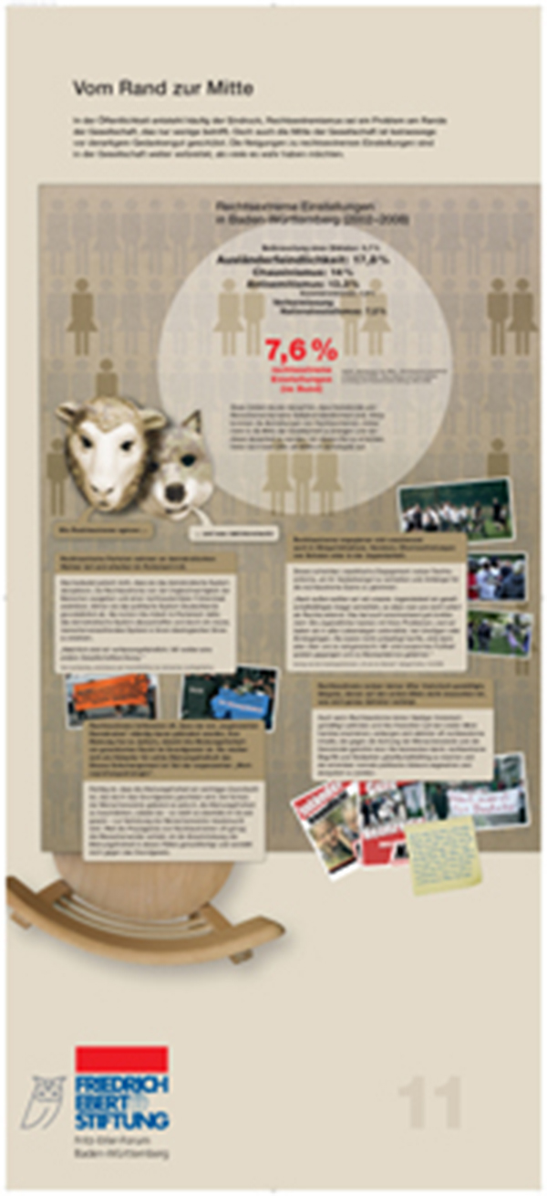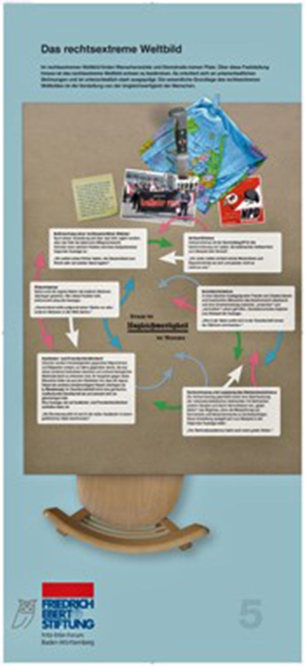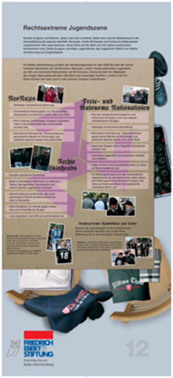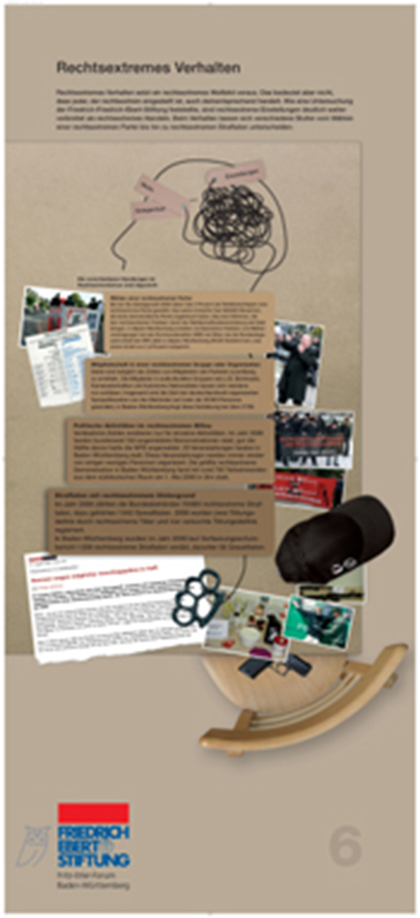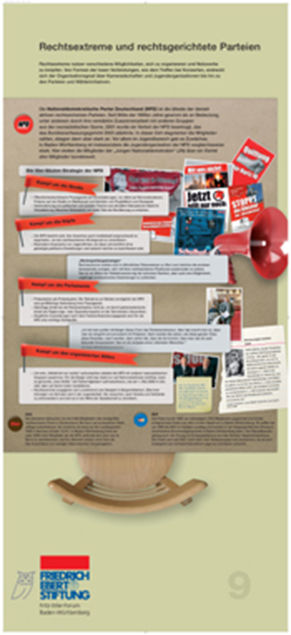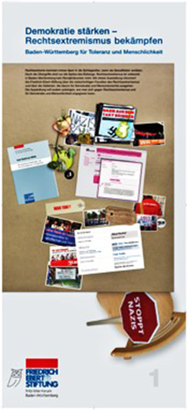 Die speziell für Jugendliche gestaltete Ausstellung des Forums Jugend und Politik der Friedrich-Ebert-Stiftung weist auf 15 Ausstellungstafeln auf die Gefahren hin, die vom Rechtsextremismus für Demokratie und Menschenrechte ausgehen, und informiert über die verschiedenen Facetten des Rechtsextremismus mit speziellem Fokus auf Entwicklungen in Nordrhein-Westfalen. Es werden mögliche Gründe für und die Ausprägungen von rechtsextremen Einstellungen und Weltbildern dargestellt und aufgezeigt, welche Formen rechtsextremes Verhalten annehmen kann. Dabei wird der Bogen von rechtsextremen Einstellungen über das Engagement in rechtsextremen Organisationen und Parteien bis hin zur rechtsextrem motivierten Straftat geschlagen. Ein besonderer Fokus der Ausstellung liegt darauf, aufzuzeigen, wie man sich gegen Rassismus und Gewalt und für Demokratie und Menschlichkeit einsetzen kann. Die Ausstellung möchte gegen eine Normalisierung rechter Einstellungen und Übergriffe in der Nachbarschaft wirken und zu Zivilcourage ermuntern.