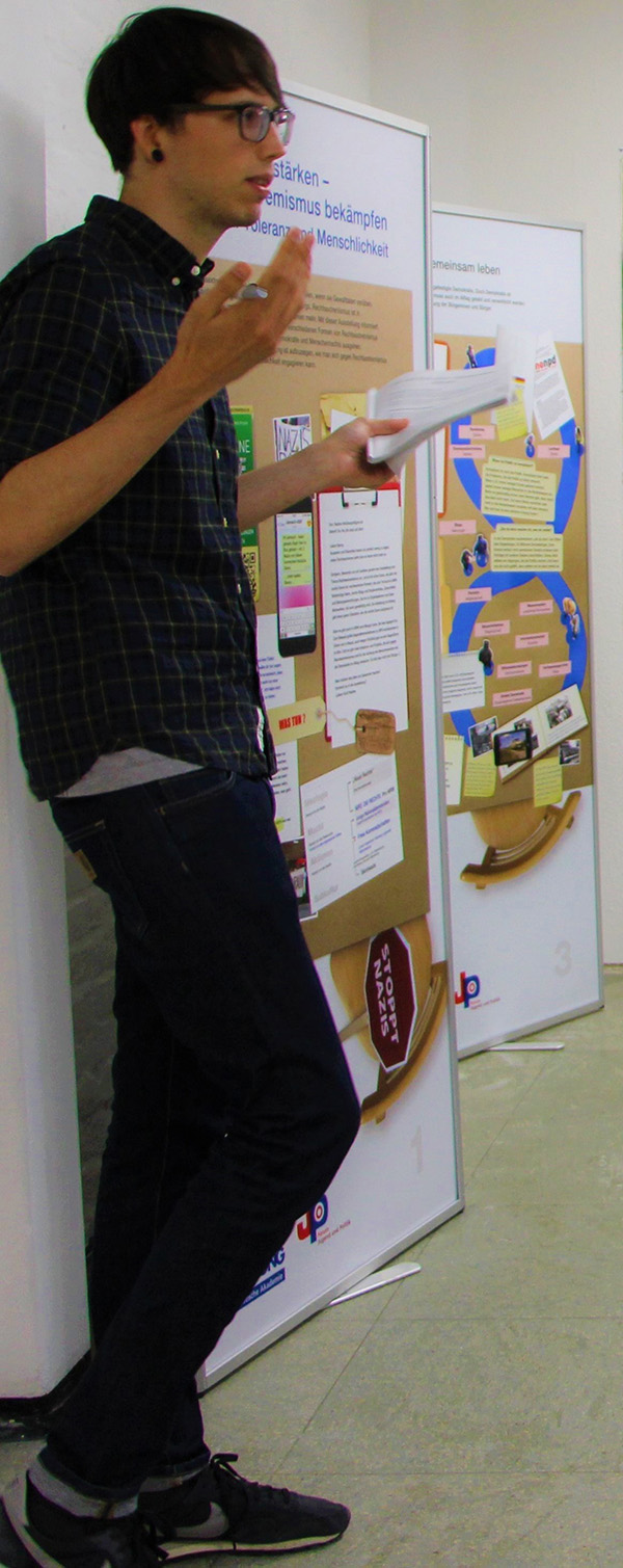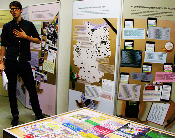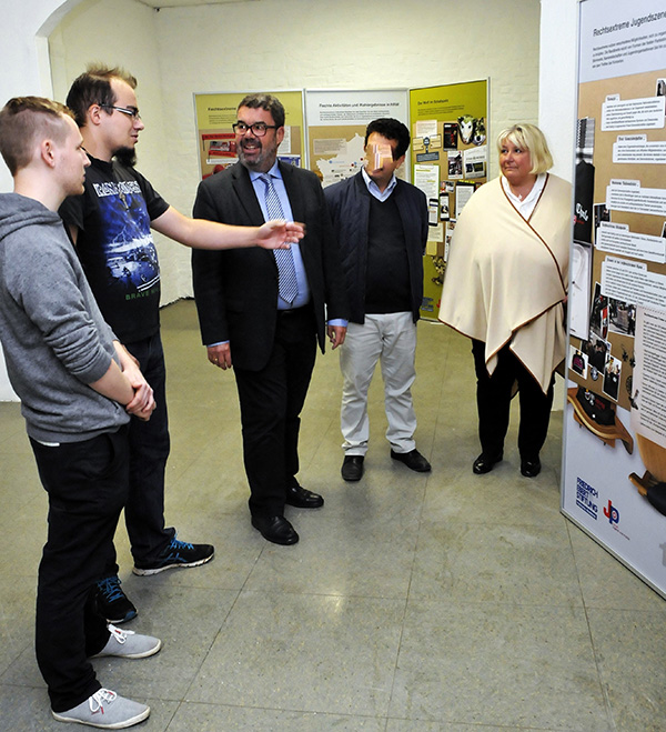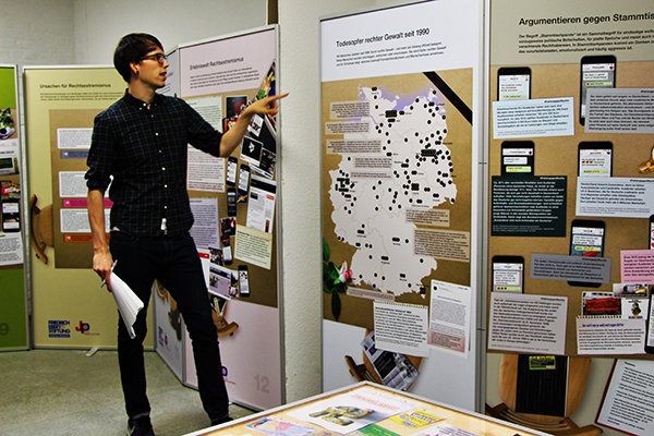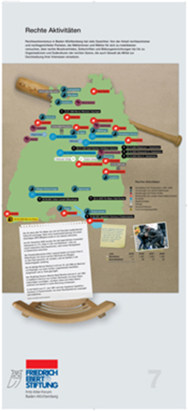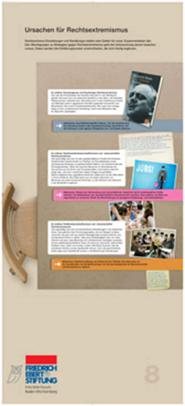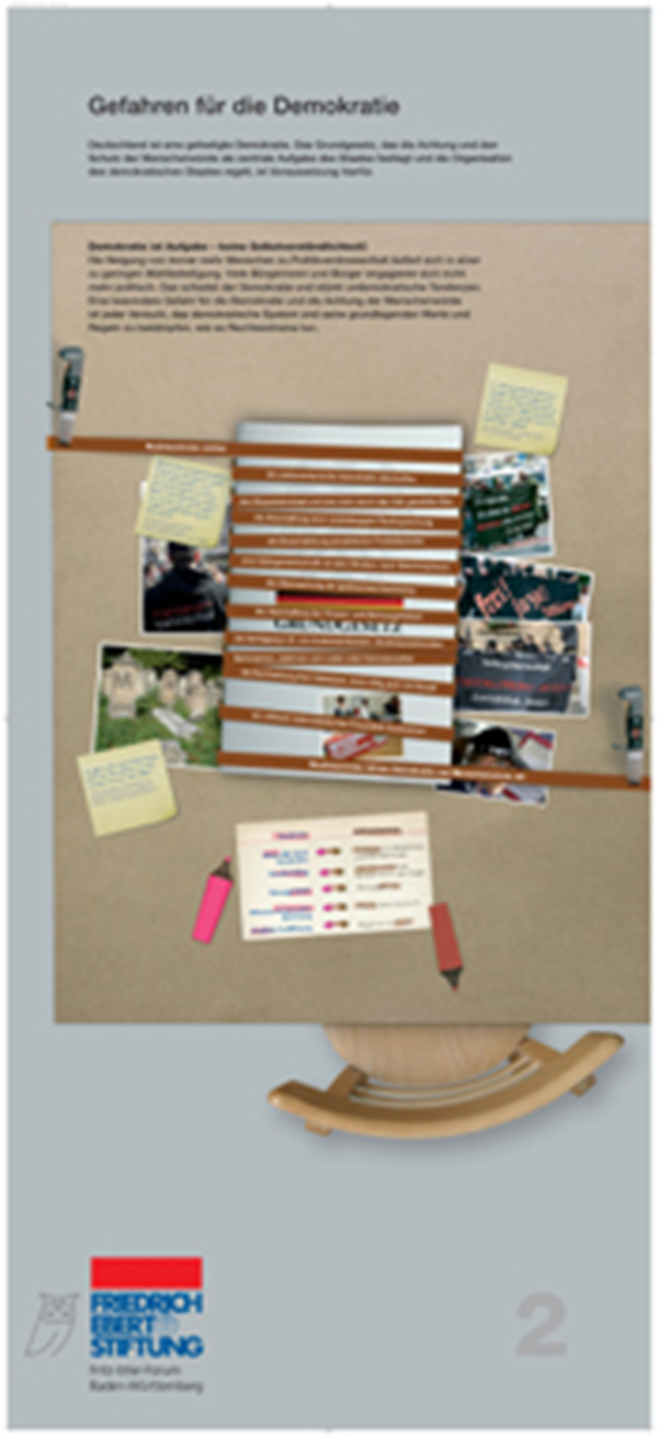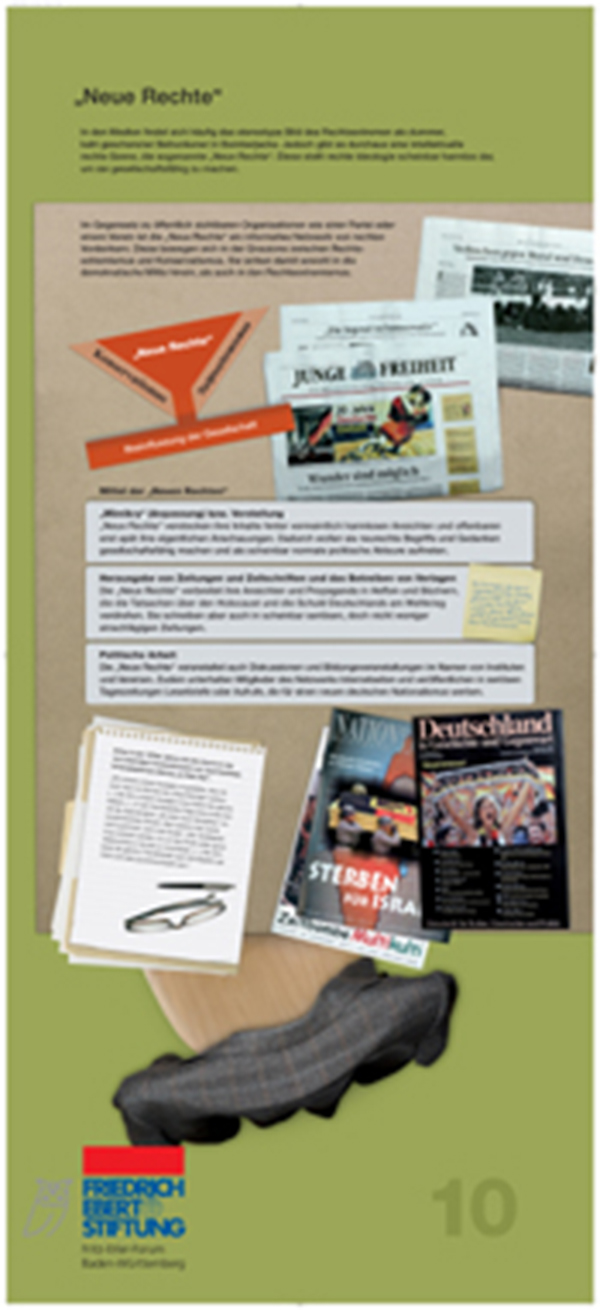 Die speziell für Jugendliche gestaltete Ausstellung des Forums Jugend und Politik der Friedrich-Ebert-Stiftung weist auf 15 Ausstellungstafeln auf die Gefahren hin, die vom Rechtsextremismus für Demokratie und Menschenrechte ausgehen, und informiert über die verschiedenen Facetten des Rechtsextremismus mit speziellem Fokus auf Entwicklungen in Nordrhein-Westfalen. Es werden mögliche Gründe für und die Ausprägungen von rechtsextremen Einstellungen und Weltbildern dargestellt und aufgezeigt, welche Formen rechtsextremes Verhalten annehmen kann. Dabei wird der Bogen von rechtsextremen Einstellungen über das Engagement in rechtsextremen Organisationen und Parteien bis hin zur rechtsextrem motivierten Straftat geschlagen. Ein besonderer Fokus der Ausstellung liegt darauf, aufzuzeigen, wie man sich gegen Rassismus und Gewalt und für Demokratie und Menschlichkeit einsetzen kann. Die Ausstellung möchte gegen eine Normalisierung rechter Einstellungen und Übergriffe in der Nachbarschaft wirken und zu Zivilcourage ermuntern.