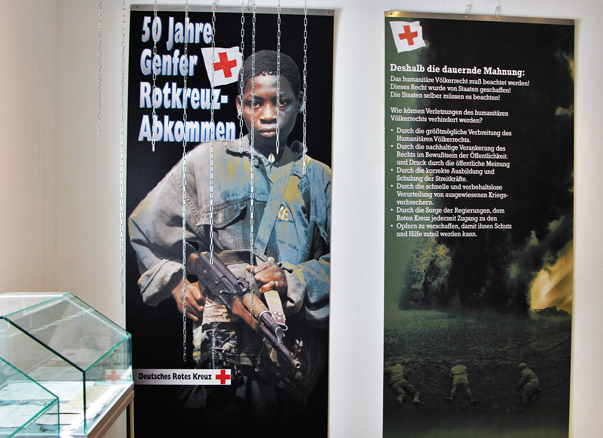 Der Fokus der Ausstellung liegt auf dem humanitären Völker- und Menschenrecht, der Geschichte und der internationalen humanitären Arbeit der Rotkreuzbewegung und der Genfer Konventionen.