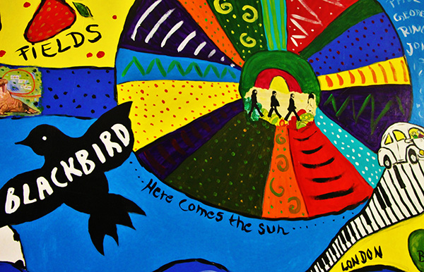 Aus einer Wand scheint sich das Heck eines VW-Käfers zu wölben. Ein Käfer dieses Modells VW 15-00 ist auf dem Cover des Albums „Abbey Road“ im Hintergrund zu sehen.