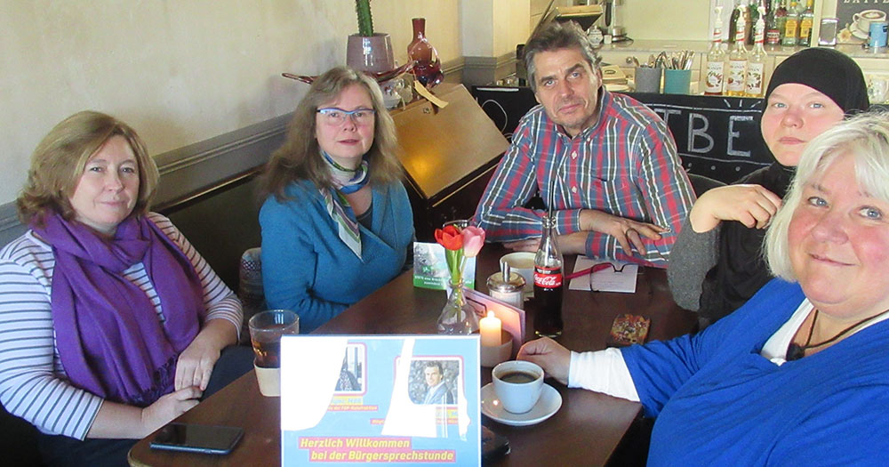 Im Rahmen einer offenen Bürgersprechstunde im Cafe Hoffmann im Sonnenhaus in Mönchengladbach mit Andreas Terhaag, MdL und Nicole Finger, MdR, FDP bot sich heute die Möglichkeit, Anregungen, Lob und Kritik persönlich mit ihnen zu besprechen. Auch konnte man Fragen zu Themen wie z. B. zur Stadtentwicklung in Mönchengladbach stellen.