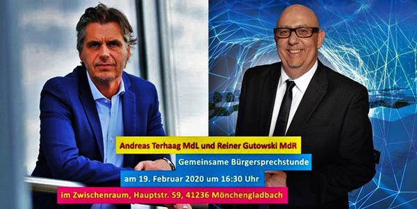 Im Rahmen der Bürgersprechstunde mit Andreas Terhaag, MdL und Reiner Gutowski, MdR, FDP bot sich heute die Möglichkeit, Anregungen, Lob und Kritik persönlich mit ihnen zu besprechen. Veranstaltungsort, ZwischenRaum, Uli und Christiane Wateler, Hauptstraße 59, 41236 Mönchengladbach-Rheydt.